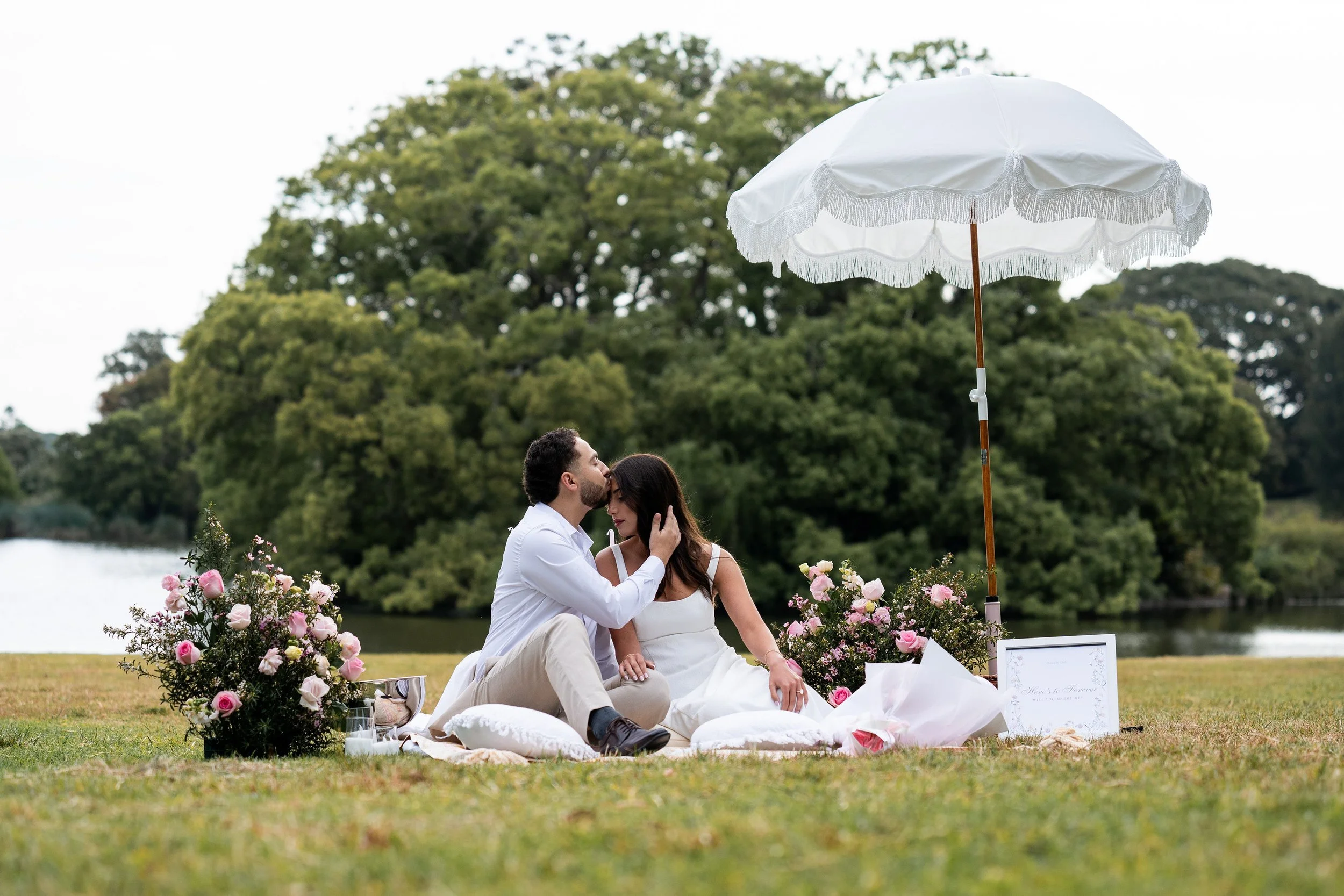 A lake-view proposal offers stillness. The water reflects the sky, the atmosphere feels peaceful, and the backdrop gives you space to focus on what matters.